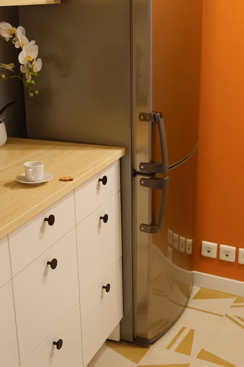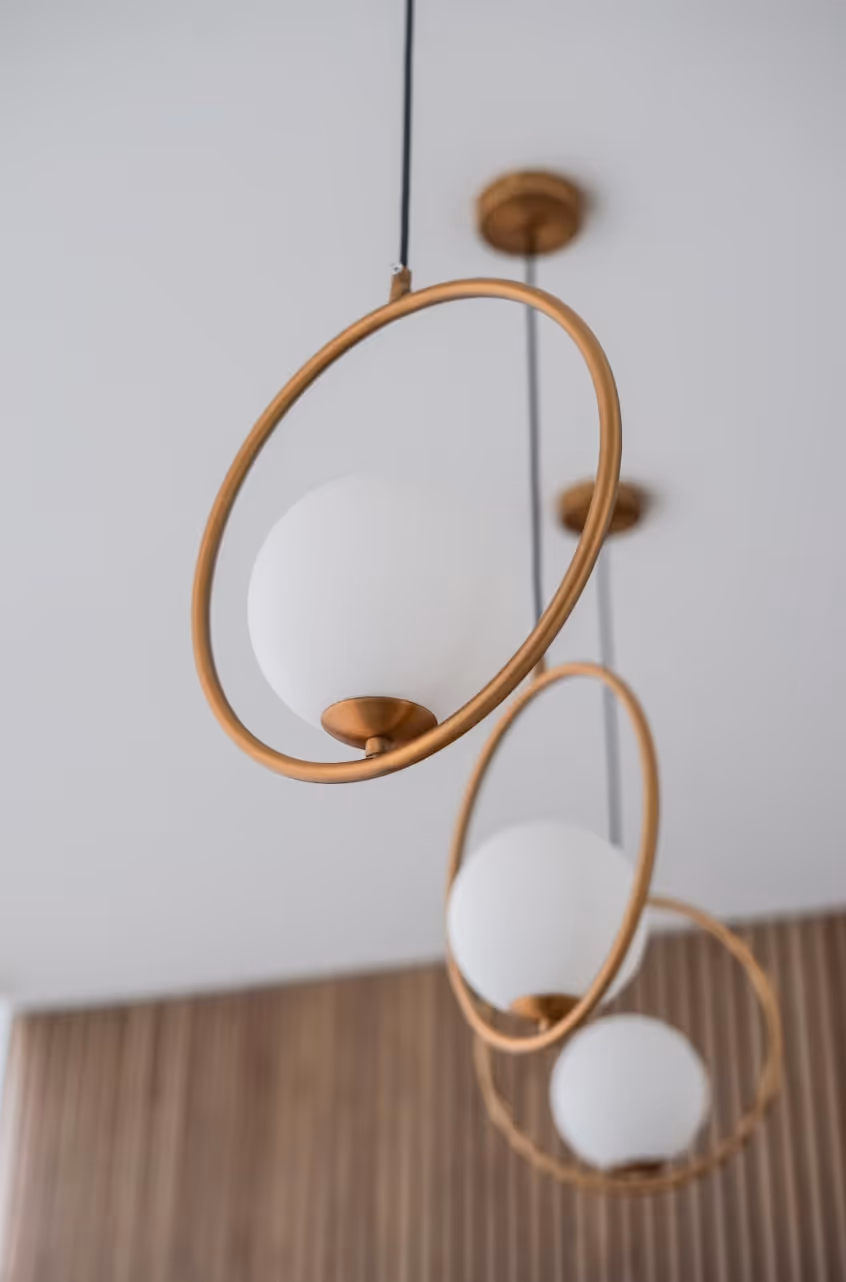 Le laiton a été choisi pour ses qualités esthétiques et sa robustesse. Utilisé par touches subtiles, il ajoute une note de sophistication et de modernité. Les poignées de portes, les luminaires et certains éléments de décoration en laiton créent un contraste harmonieux avec le bois, enrichissant l'ensemble d'une dimension contemporaine.