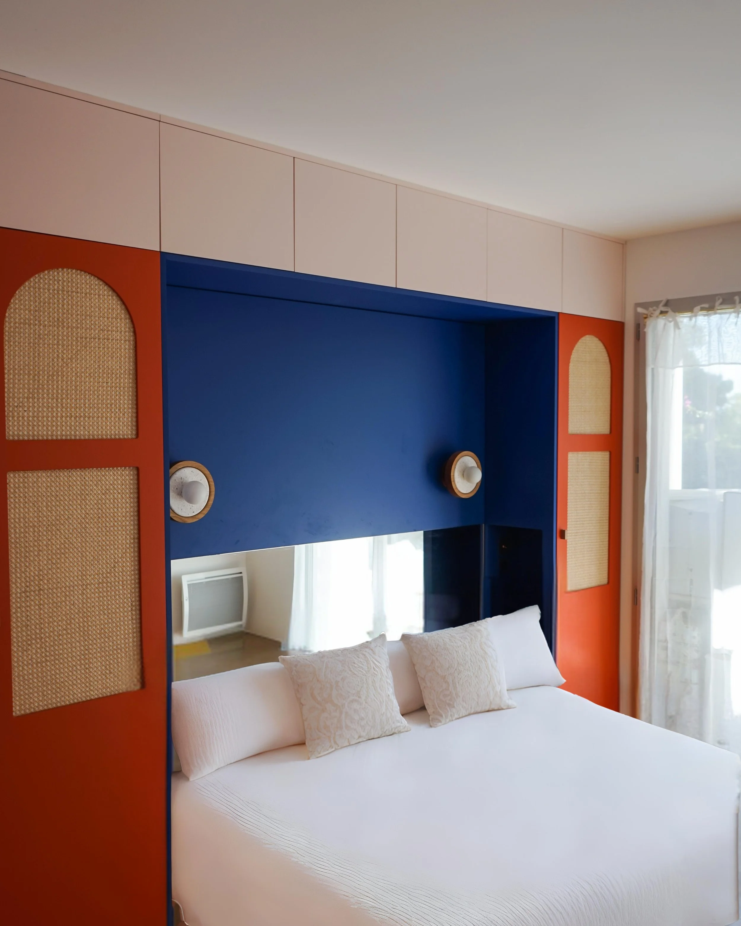 Le design du pont de lit a été pensé pour être audacieux et fonctionnel. Nous avons utilisé des couleurs pop pour dynamiser l'espace et des arches pour adoucir et moderniser l’ensemble. Maximiser chaque recoin de la chambre était essentiel pour intégrer des rangements pratiques tout en maintenant un espace fluide et dégagé. Nous avons optimisé les angles pour créer des solutions de rangement discrètes et intelligentes, et choisi des éléments multifonctionnels qui économisent de l’espace sans compromettre le design. Le miroir en tête de lit a été pensé pour apporter une autre dimension à la chambre. Ainsi, nous avons la sensation que la pièce est encore plus grande qu'elle ne l'est réellement.