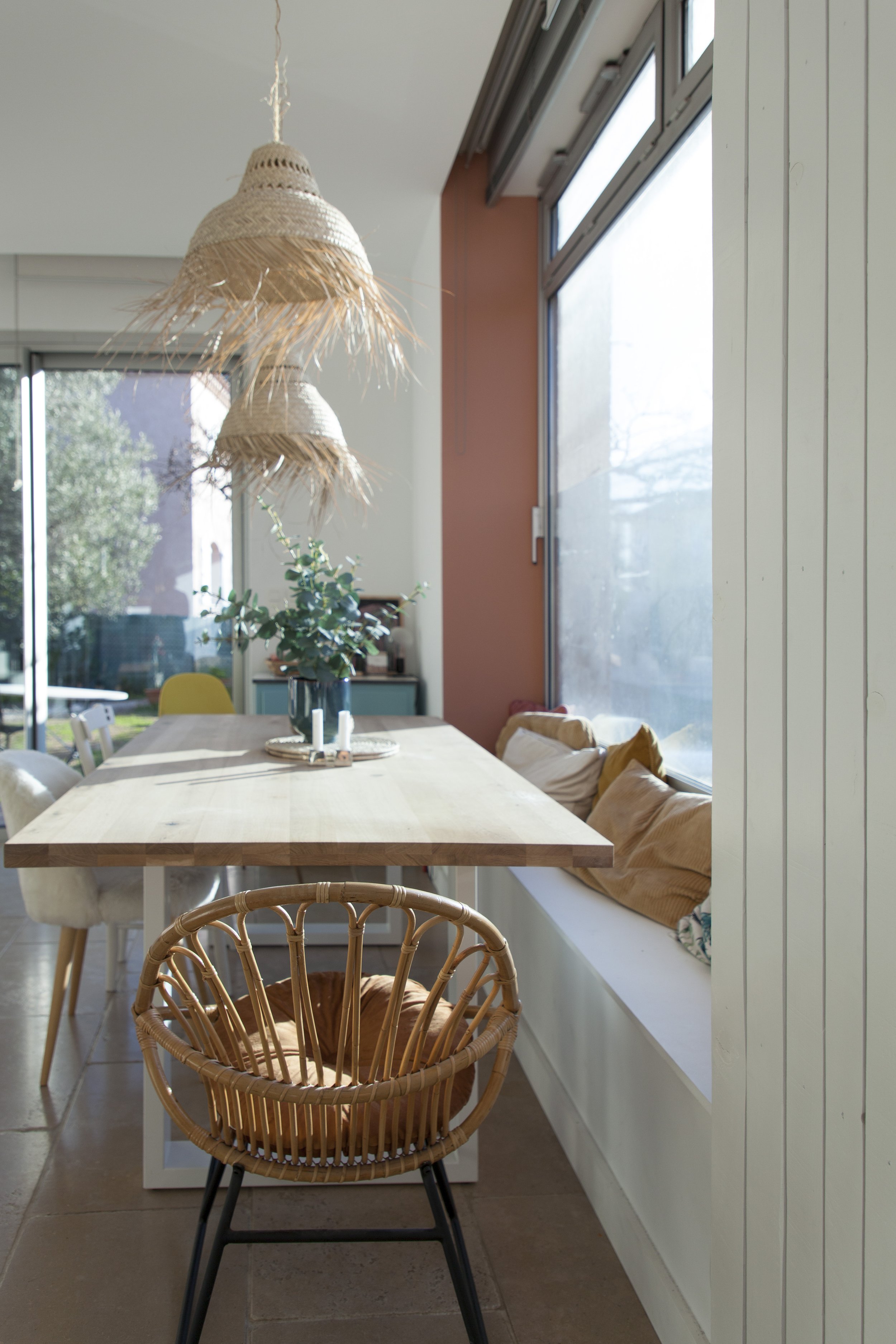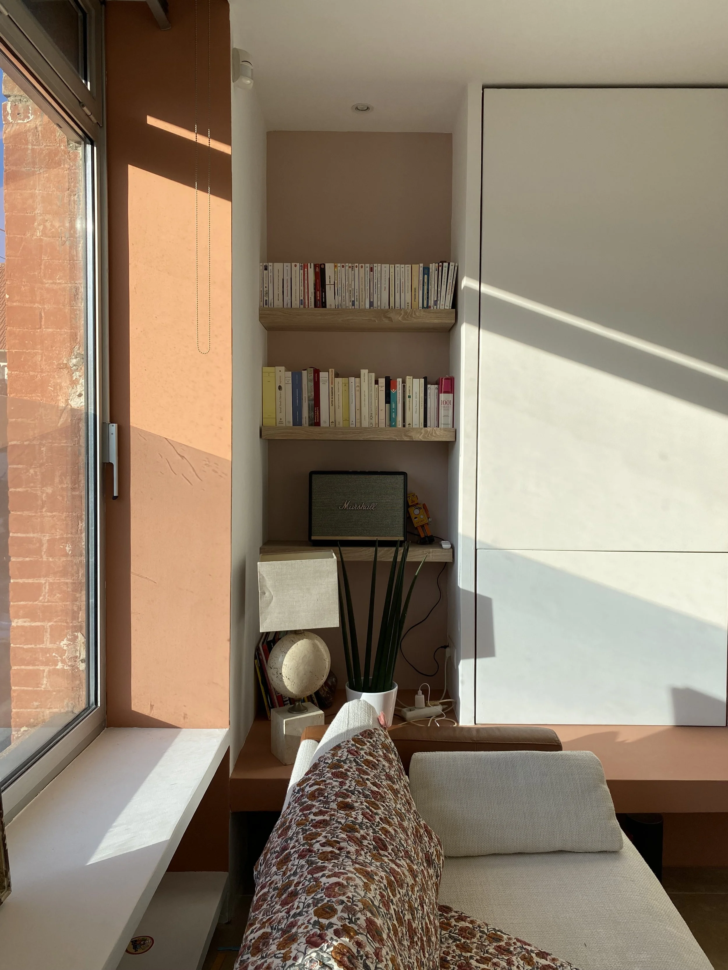 Au cœur de cette rénovation, l'accent a été mis sur l'intégration de l'artisanat marocain. Les zelliges, ces carreaux de céramique émaillée façonnés à la main, ornent les murs de la cuisine. Leur couleur vert émeraude capte la lumière du soleil, ajoutant une touche d'authenticité et de vivacité à chaque pièce. Le mariage du béton ciré et du bois crée un contraste saisissant et pourtant harmonieux. Le béton ciré, avec ses lignes épurées et sa texture moderne, se fond parfaitement avec les accents de bois naturel qui apportent chaleur et caractère à l'espace.