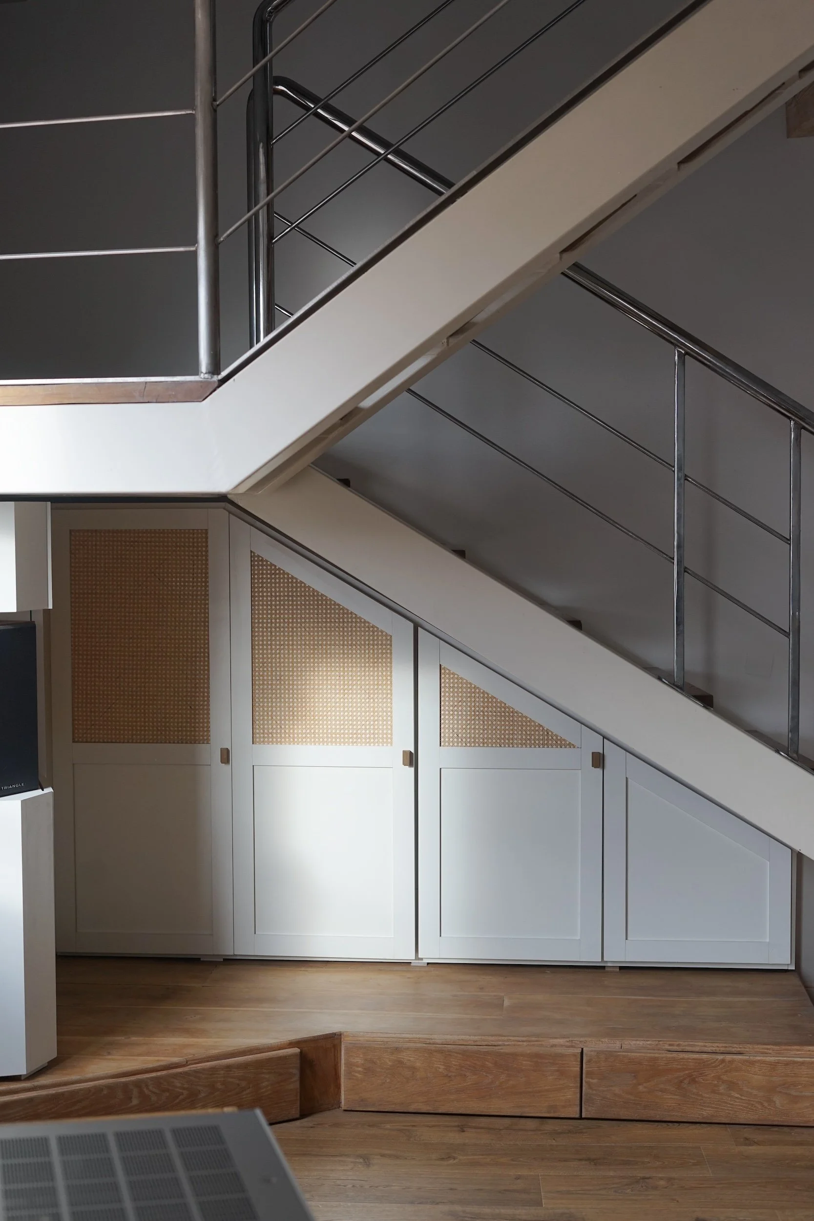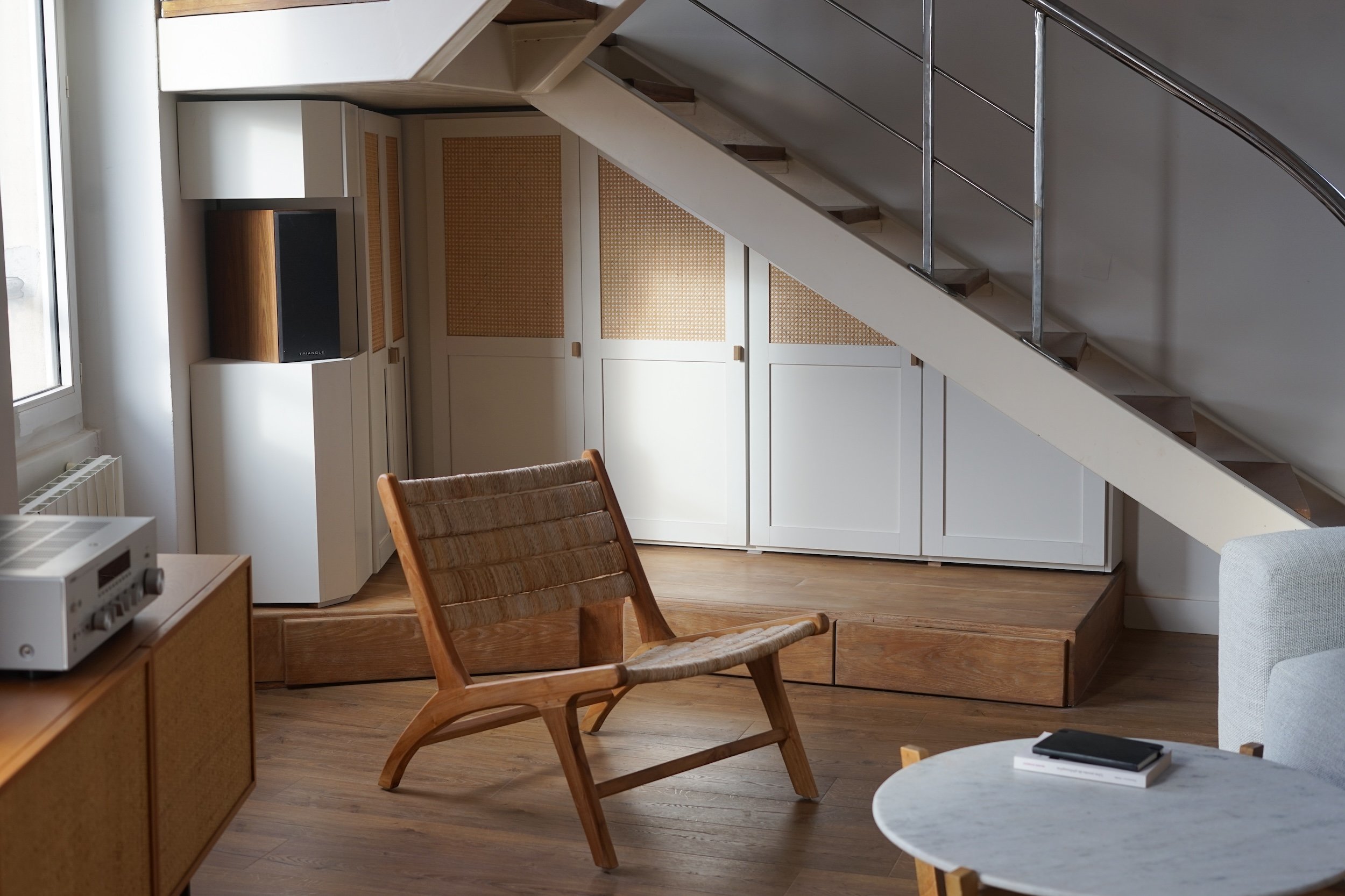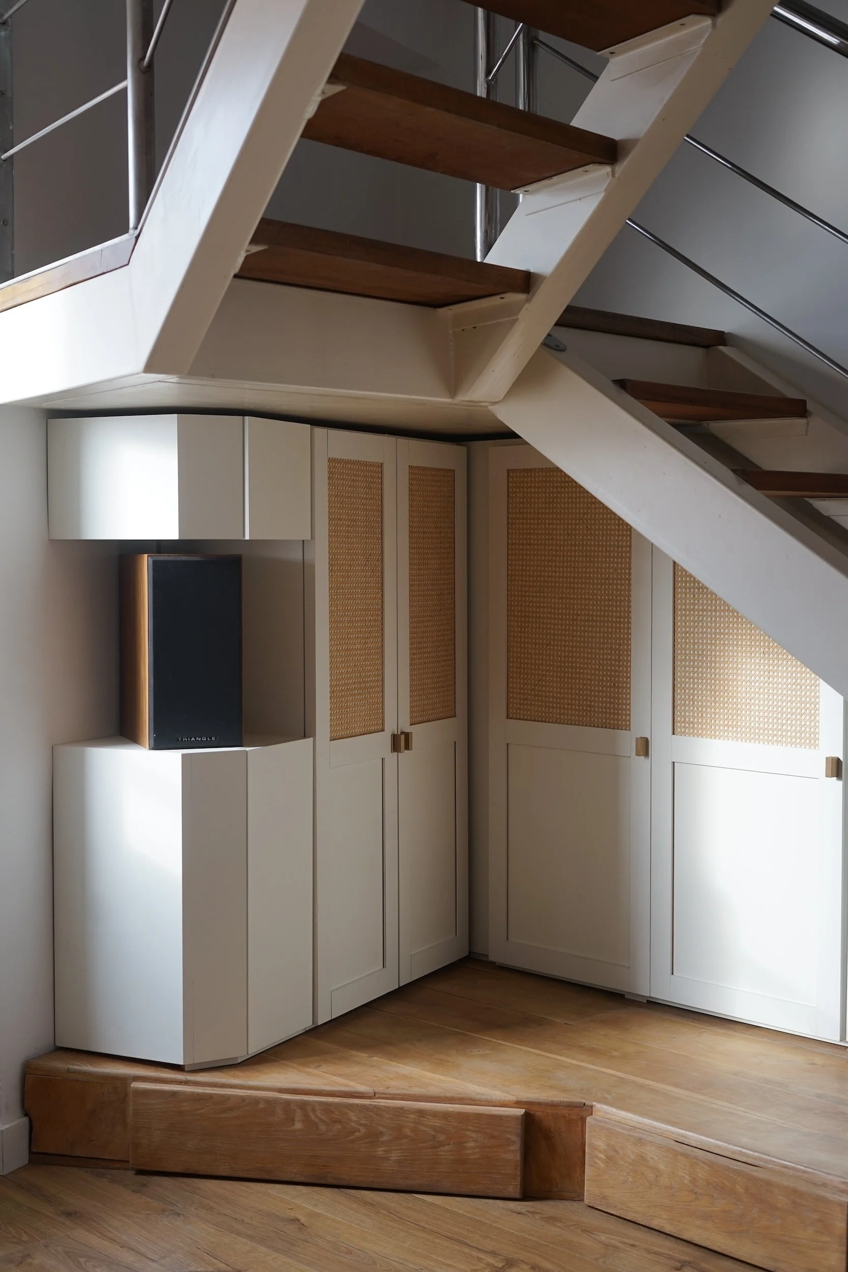 La particularité du duplex résidait dans ses formes irrégulières. Pour tirer le meilleur parti de cet espace singulier, nous avons opté pour des aménagements sur-mesure. Chaque meuble, rangement et détail a été pensé pour épouser les courbes de l’appartement et optimiser chaque mètre carré, sans jamais trahir le charme de l’ancien.