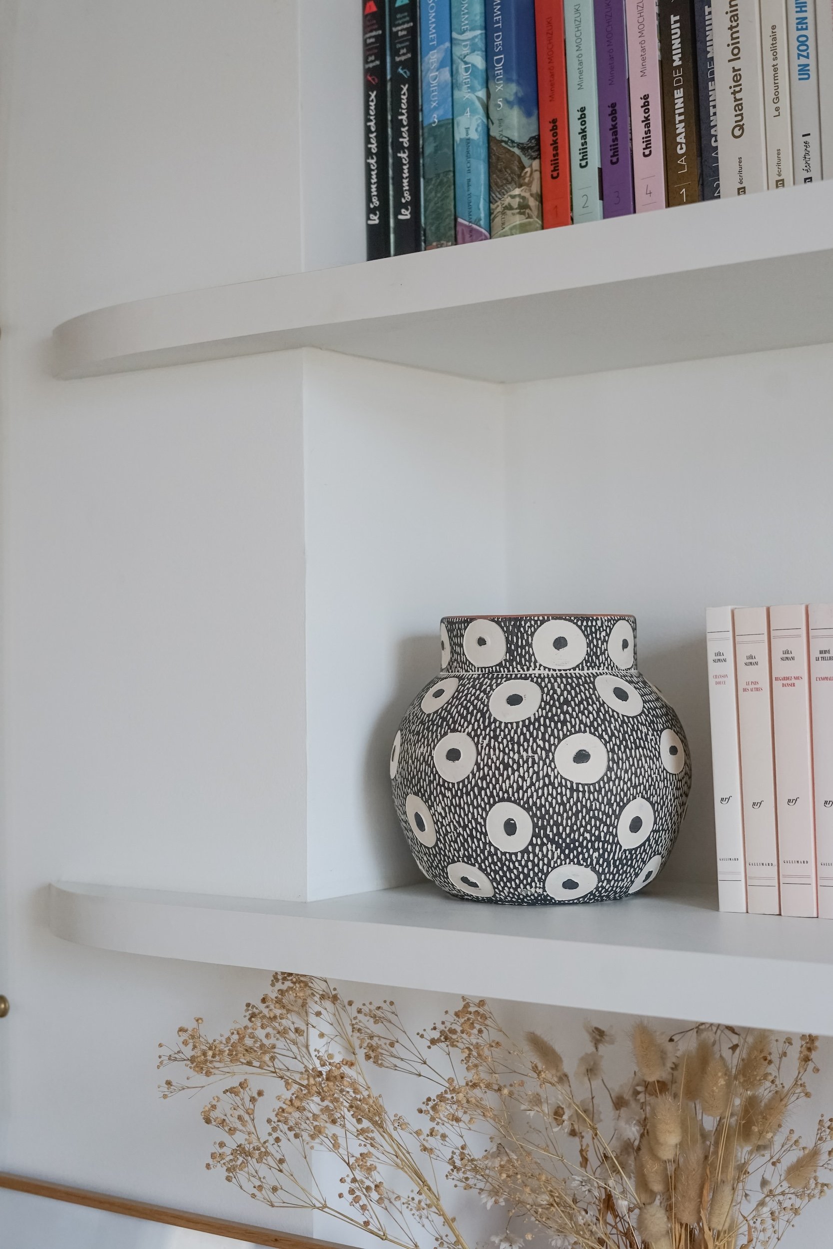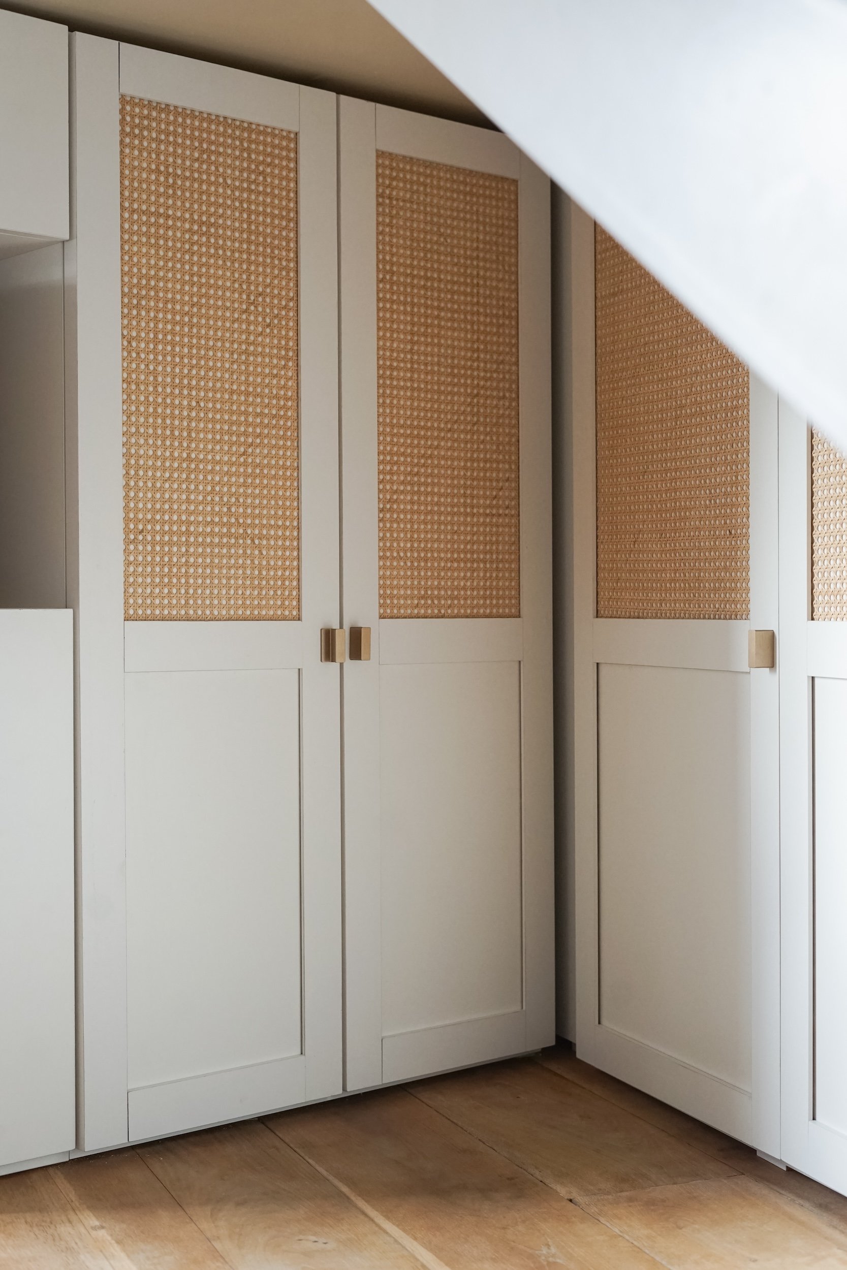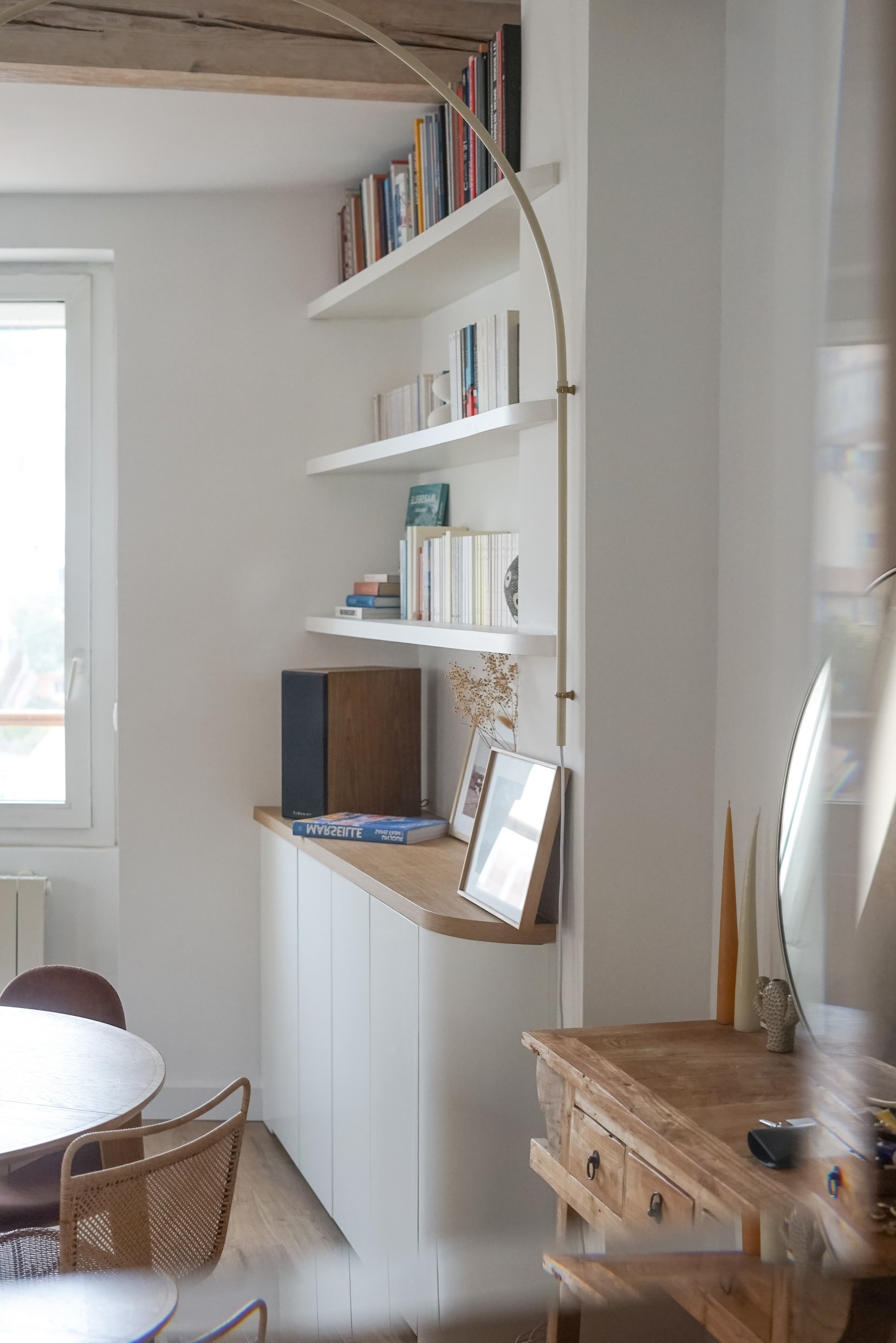 La particularité du duplex résidait dans ses formes irrégulières. Pour tirer le meilleur parti de cet espace singulier, nous avons opté pour des aménagements sur-mesure. Chaque meuble, rangement et détail a été pensé pour épouser les courbes de l’appartement et optimiser chaque mètre carré, sans jamais trahir le charme de l’ancien.